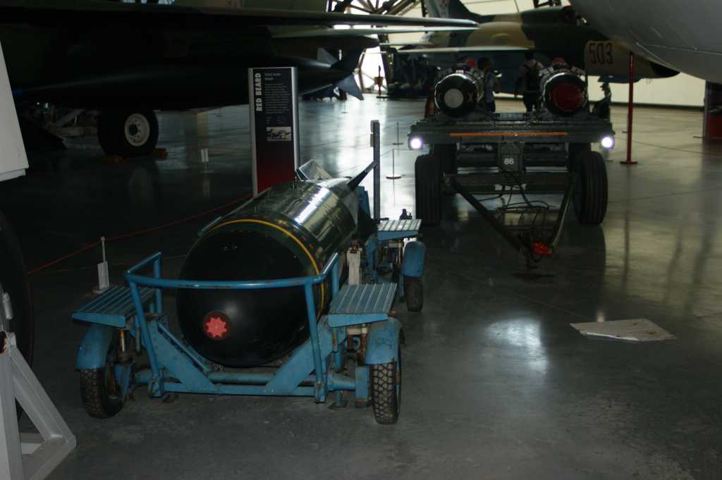 There are some excellent and unique Cold War aircraft on display. I enjoyed seeing Nimrod XV249 (unfortunately exhibited outdoors, subject to the elements), the Lightning test-bed WG760, Valiant XD818 in white anti-flash paint, as well as the TSR-2 (of course). There was a somewhat morbid fascination to be had with seeing a Thor IRBM (1.44 megatons yield), a Red Beard ‘tactical’ nuclear bomb casing (yield 15-25 kilotons, mk 1 or 2) and a Yellow Sun strategic hydrogen bomb casing (yield 400kt or 1.1Mt, Green Grass or Red Snow warheads).