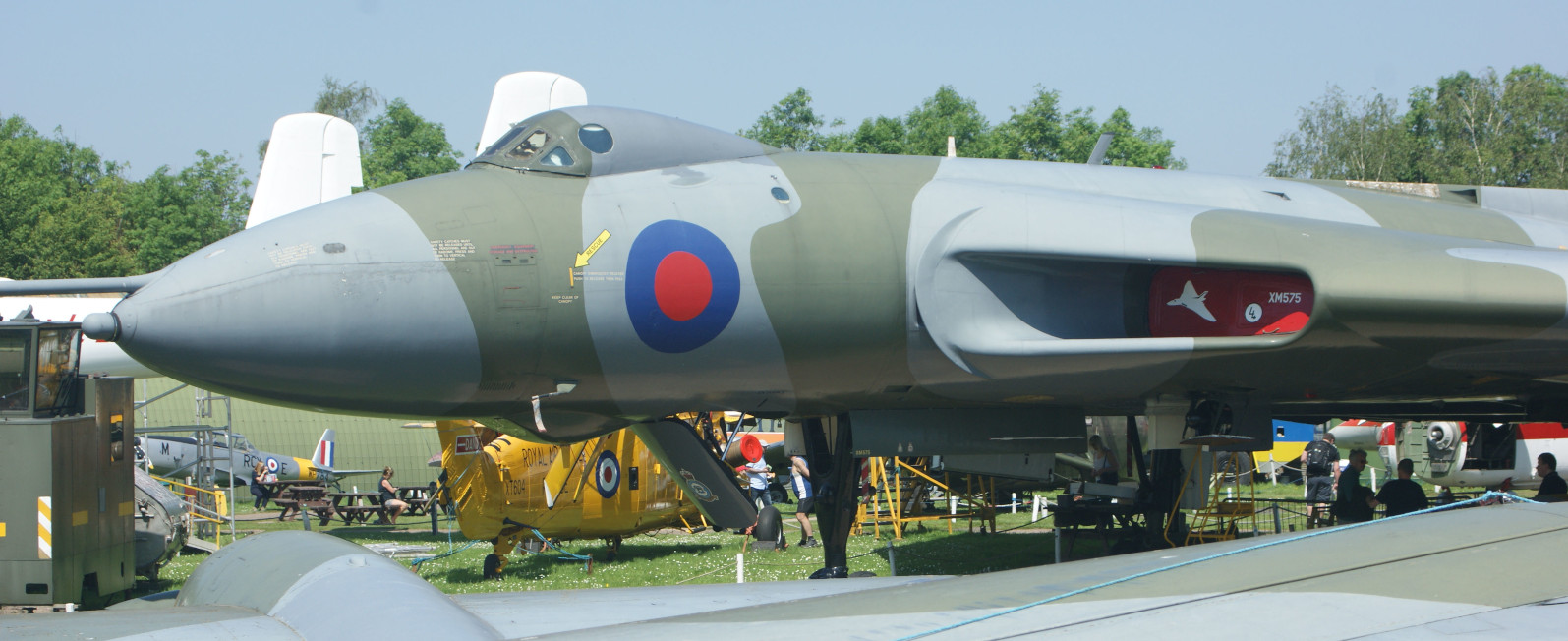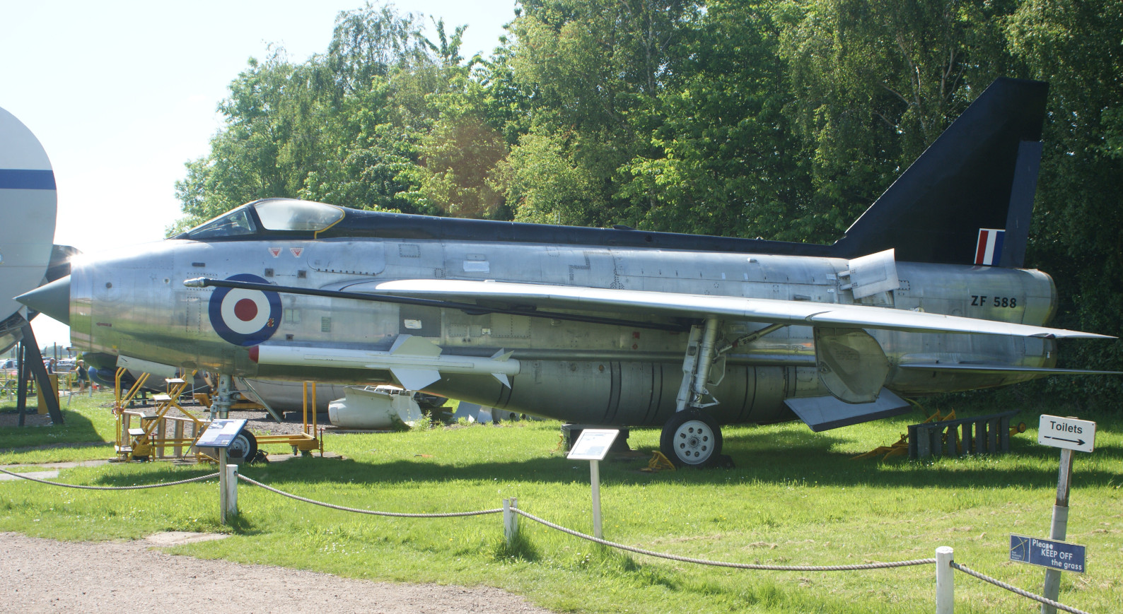 The tandem-seat Hunter trainer, XL569, was interesting to see and in good condition, as was the FR10 mark XJ714. However, the GA11 variant WV382 was obviously in need of a coat of paint and not shown in its best light. Jaguar XZ369 was very-well displayed, with open avionics bays. Lightning ZF588 was also very-well displayed, and this was the first time that I had properly noticed just how large the Lightning airframe is.