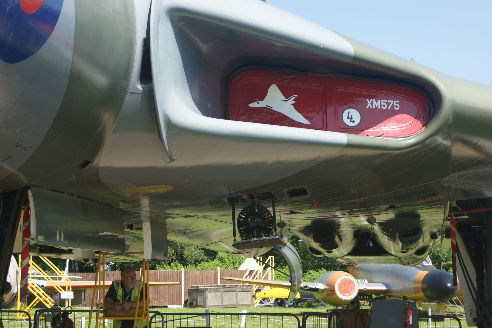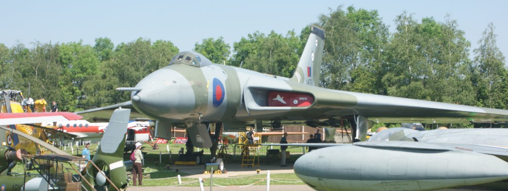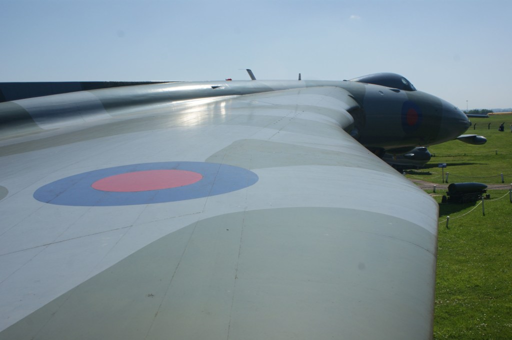 For me though, the overall star of the show was Vulcan B2 XM575. The curator was on hand to talk about this airframe, explaining that the engines are still in place and all the electrics are working. Unfortunately the clutch plate for the bomb-bay doors was needing to be replaced, so they could not demonstrate that mechanism. That was more than compensated for by a view above and along the wing’s leading edge, showing that its shape is much more complex than the simple delta that you see from below. It was also interesting to see the Ram Air Turbine (“RAT”) deployed – this would have provided electric to the aircraft if all other systems had failed, ie a power source of last resort (“deploy and pray”, as the curator said).