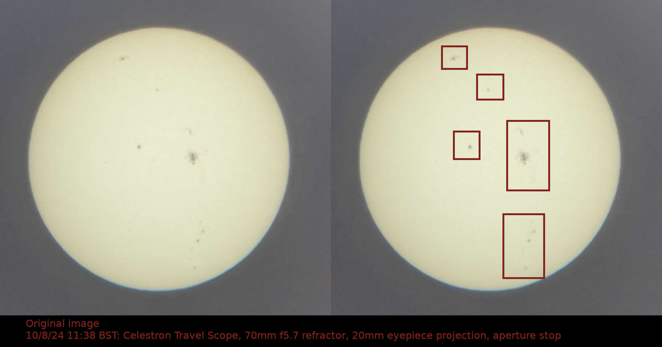 I’ve been indulging my love for Astronomy with a little 70mm / f5.7 refractor that I picked up at the start of the year. This summer was great for observing the Sun via eyepiece projection (don’t try that at home unless you know what you’re doing… I melted the inside of a 10mm eyepiece while I was getting used to this method!), and it has been fascinating watching sunspots evolving over time.